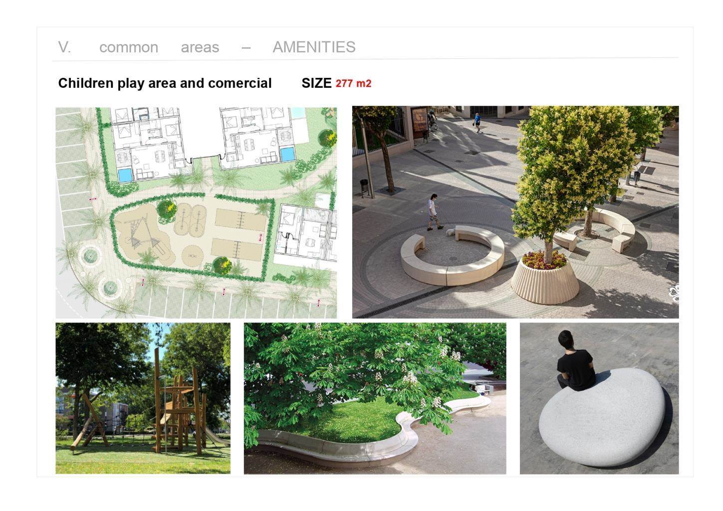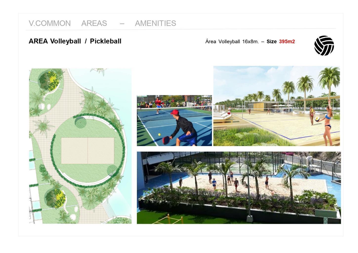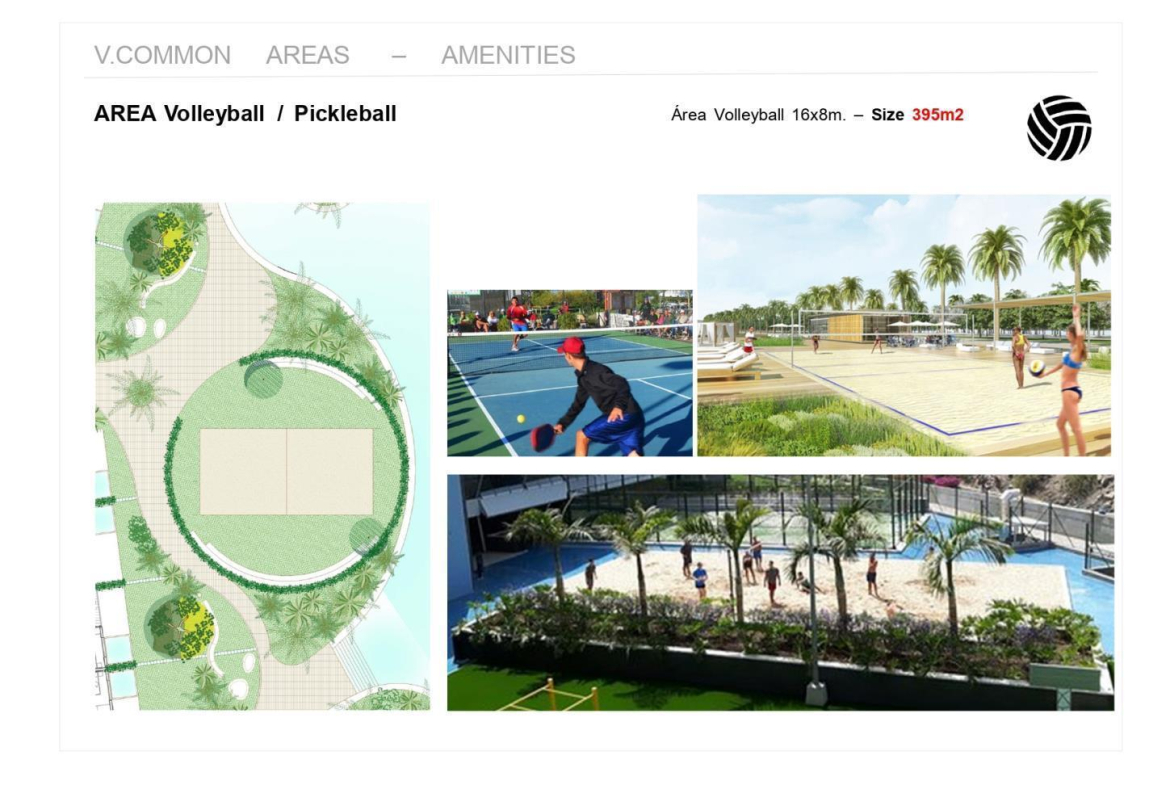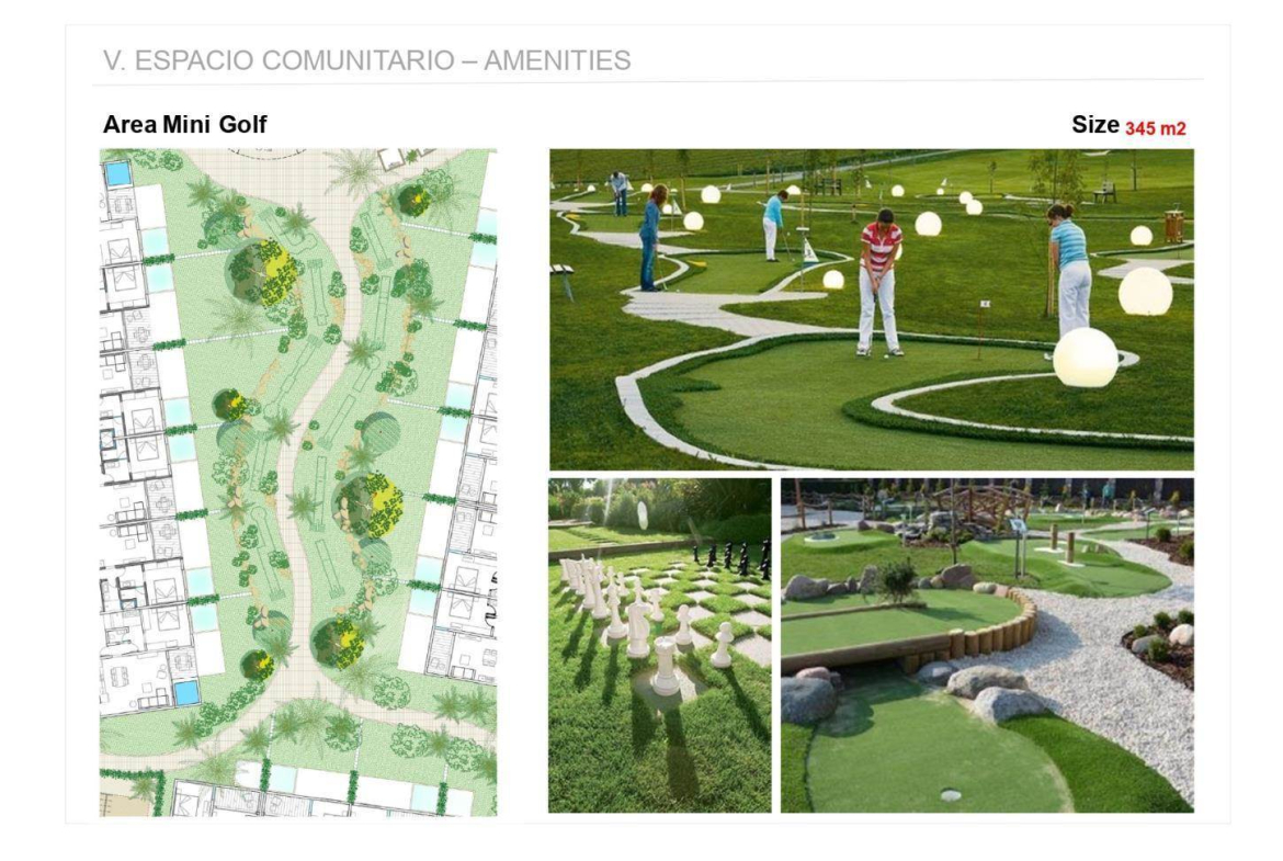 – Restaurants – A Gym – Co-working space – Beach volleyball court – Miniature golf – Swimming pool (1,800m2/19,369 sq. ft.) – Pool bar – Children swimming pool – Children playground – Large garden areas.