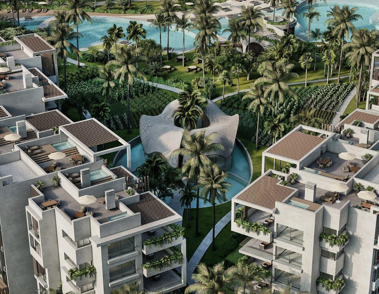 Tropical gardens surround the pool area and the buildings, and serve as an ecological holistic refuge for healthy outdoor exercise, while enjoying the lush gardens with fresh, organic, and natural surroundings for balance and harmony. The onsite pavilion is one of the most emblematic structures of this development. Exceptional and open social area spaces that perfectly integrate with nature, inviting residents to fully relax in this tropical paradise. This facility will feature different areas dedicated to leisure and relaxation: