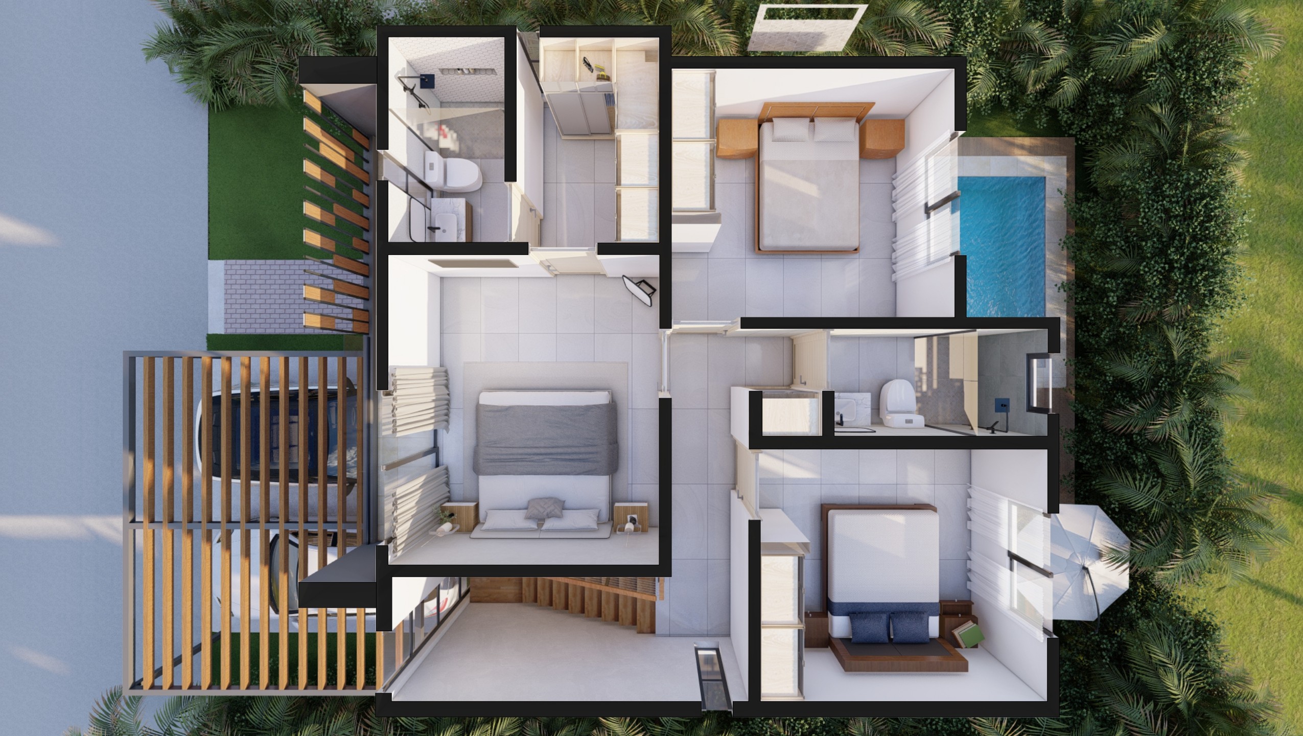 - Two additional bedrooms with shared bathroom and balcony access